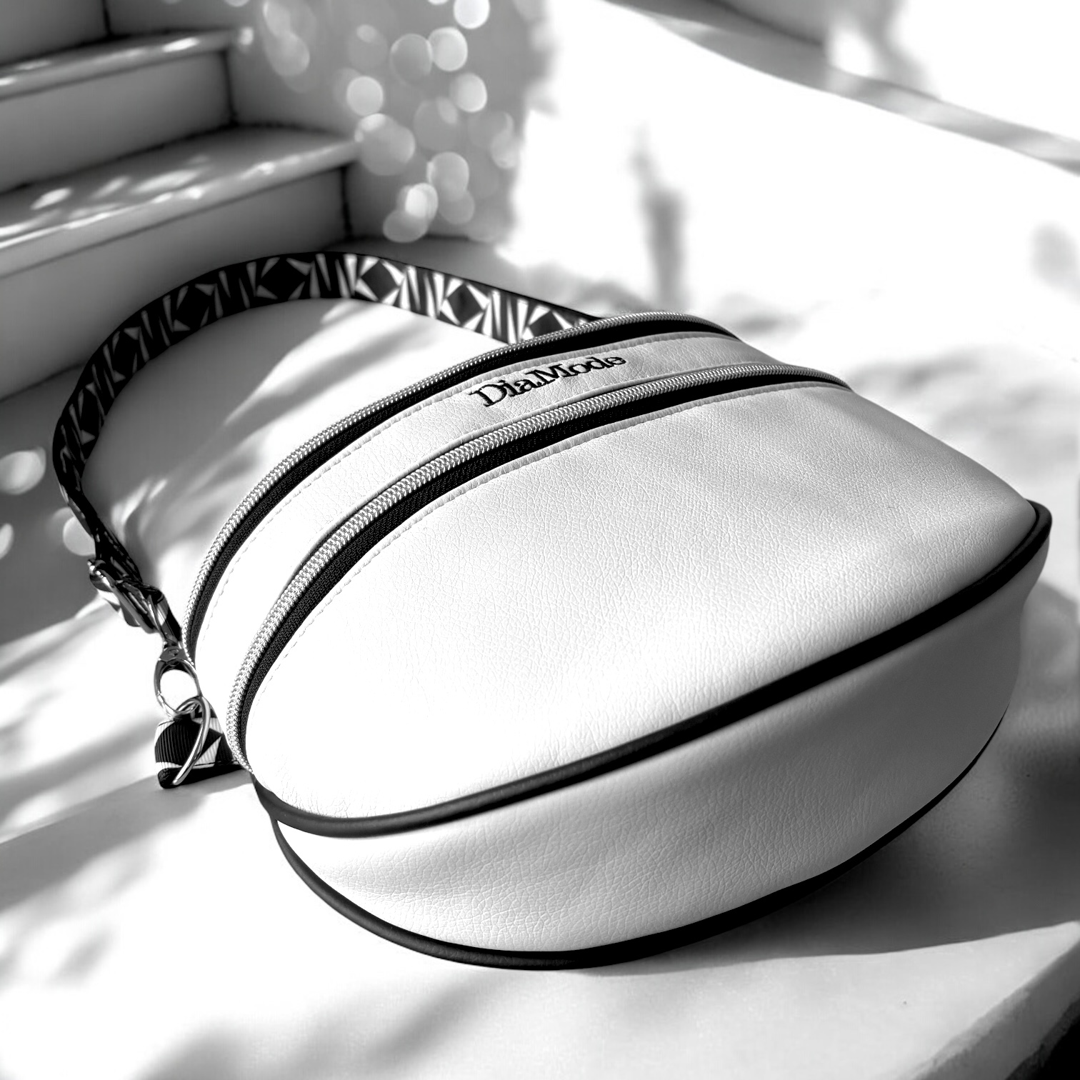 Merevítéssel ellátott többfunkciós darab, mely a karabinerekkel ellátott állítható hosszúságú mintás pánt segítségével